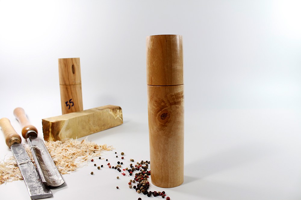 In diese Gewürzmühle habe ich ein Keramikmahlwerk eingebaut, so können Sie sie gleichermaßen als Pfeffermühle, oder Salzmühle oder auch für allerlei andere Gewürze, die gemahlen werden können (und hineinpassen) verwenden.