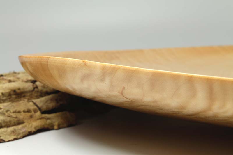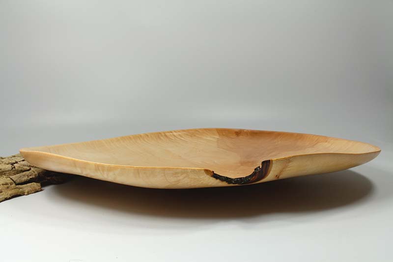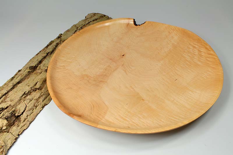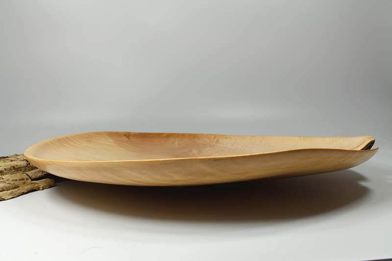 Beim Drehen dieser riesigen Stücke sah ich, wie wunderschön geflammt (Riegelwuchs) das Holz ist. Es hat eine Dreidimensionalität wie ? Perlmutt. Eine wunderschöne Farbe, Splint hell und breit, der Kern dunkel und mit Schlieren durchzogen. Das Wasser spritzte nur so beim Drehen und natürlich verzogen sich die Schalen wunderschön beim Trocknen.