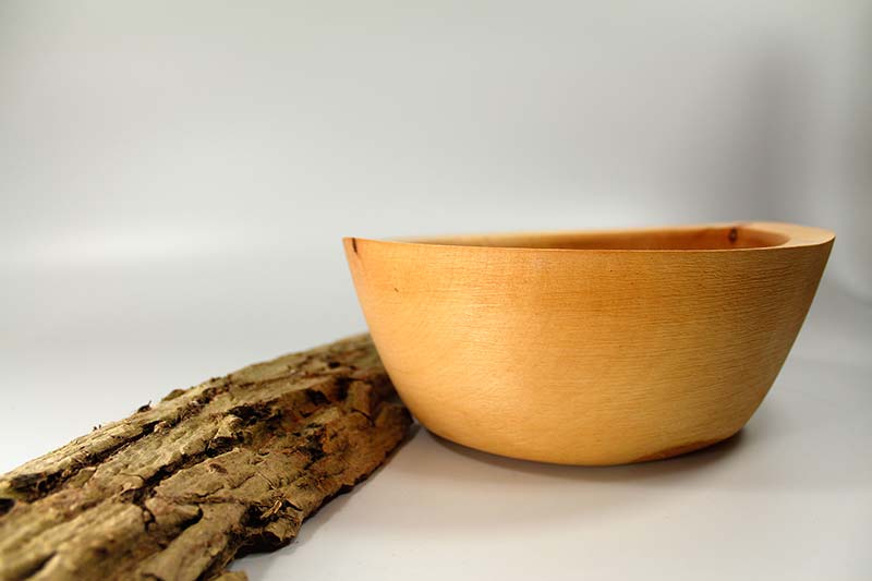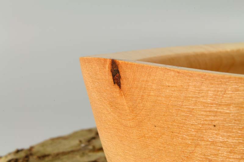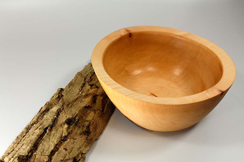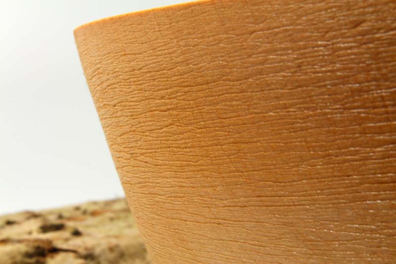 Beim Drehen dieser riesigen Stücke sah ich, wie wunderschön geflammt (Riegelwuchs) das Holz ist. Es hat eine Dreidimensionalität wie ? Perlmutt. Eine wunderschöne Farbe, Splint hell und breit, der Kern dunkel und mit Schlieren durchzogen. Das Wasser spritzte nur so beim Drehen und natürlich verzogen sich die Schalen wunderschön beim Trocknen.