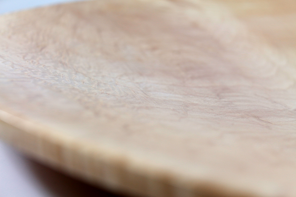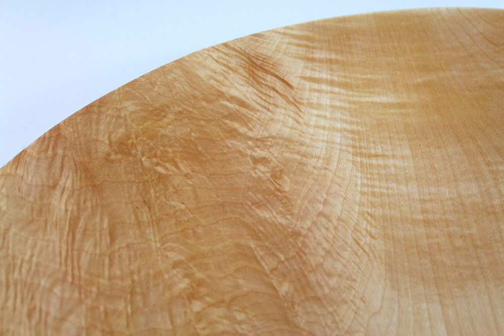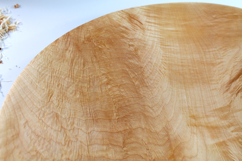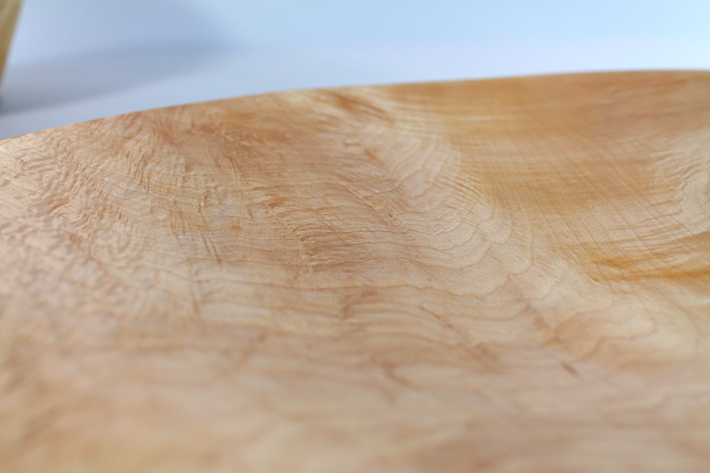 Beim Drehen dieser riesigen Stücke sah ich, wie wunderschön geflammt (Riegelwuchs) das Holz ist. Es hat eine Dreidimensionalität wie ? Perlmutt. Eine wunderschöne Farbe, Splint hell und breit, der Kern dunkel und mit Schlieren durchzogen. Das Wasser spritzte nur so beim Drehen und natürlich verzogen sich die Schalen wunderschön beim Trocknen.