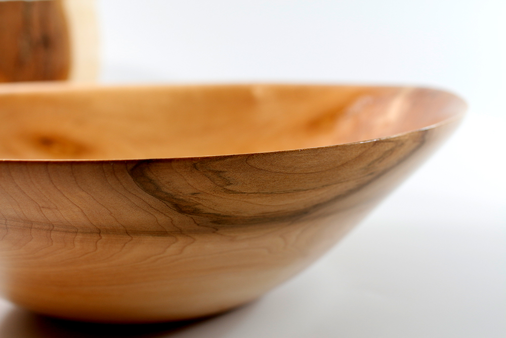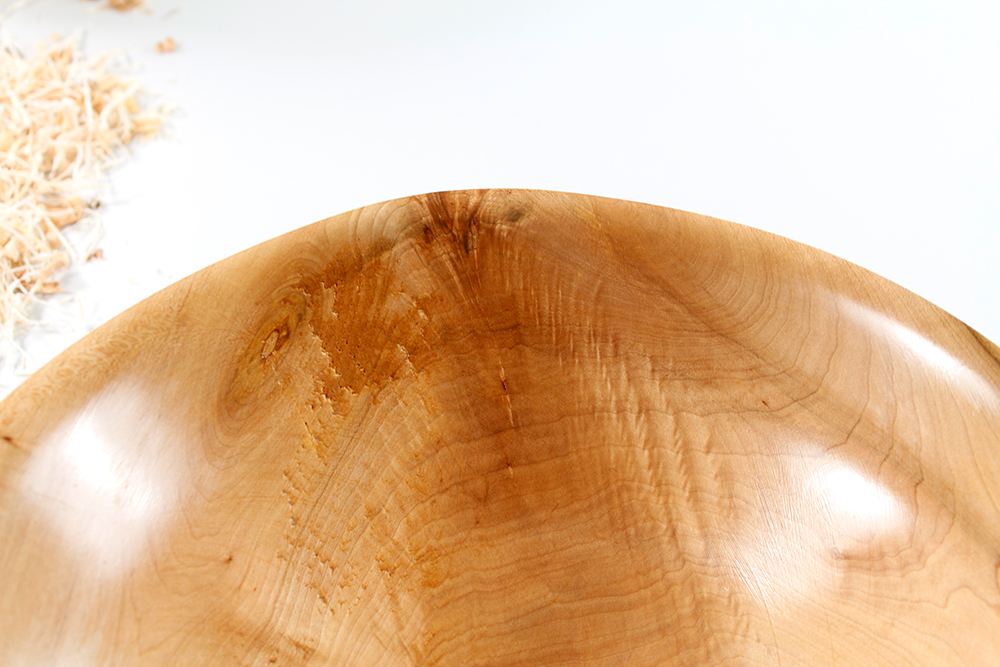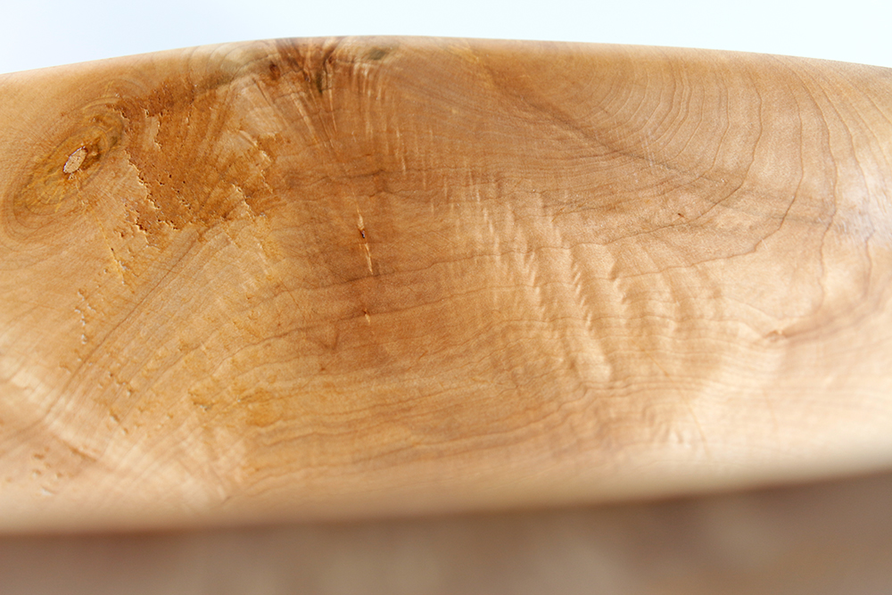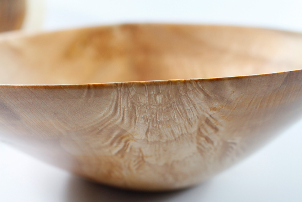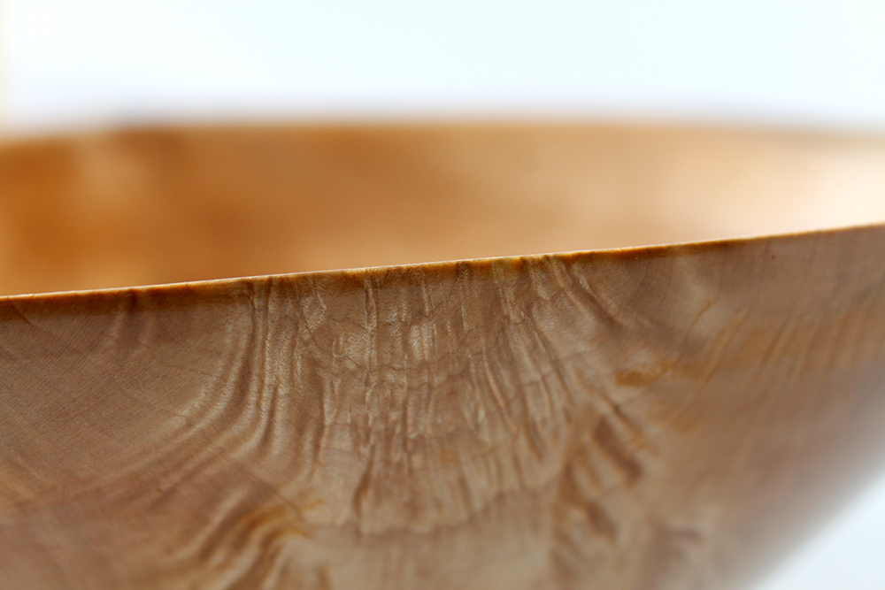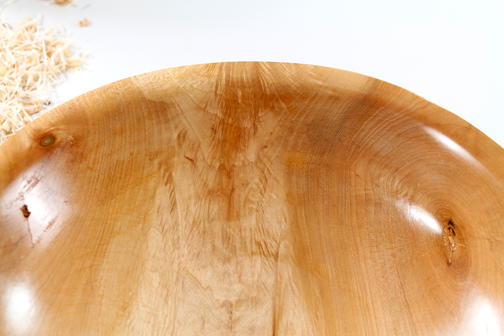 Beim Drehen dieser riesigen Stücke sah ich, wie wunderschön geflammt (Riegelwuchs) das Holz ist. Es hat eine Dreidimensionalität wie ? Perlmutt. Eine wunderschöne Farbe, Splint hell und breit, der Kern dunkel und mit Schlieren durchzogen. Das Wasser spritzte nur so beim Drehen und natürlich verzogen sich die Schalen wunderschön beim Trocknen.