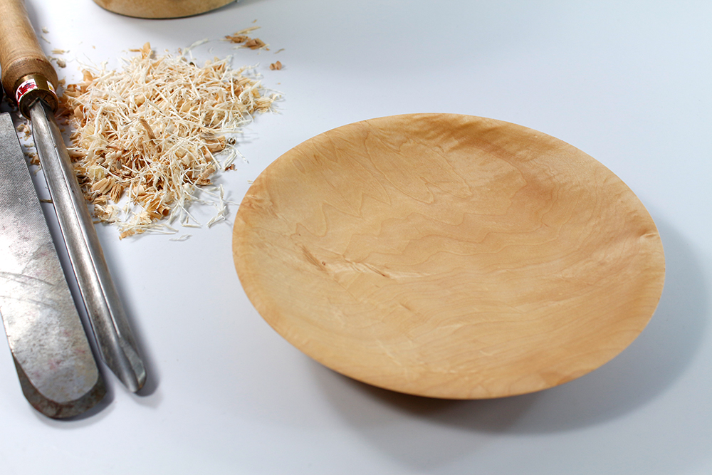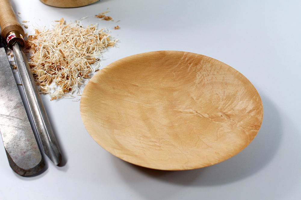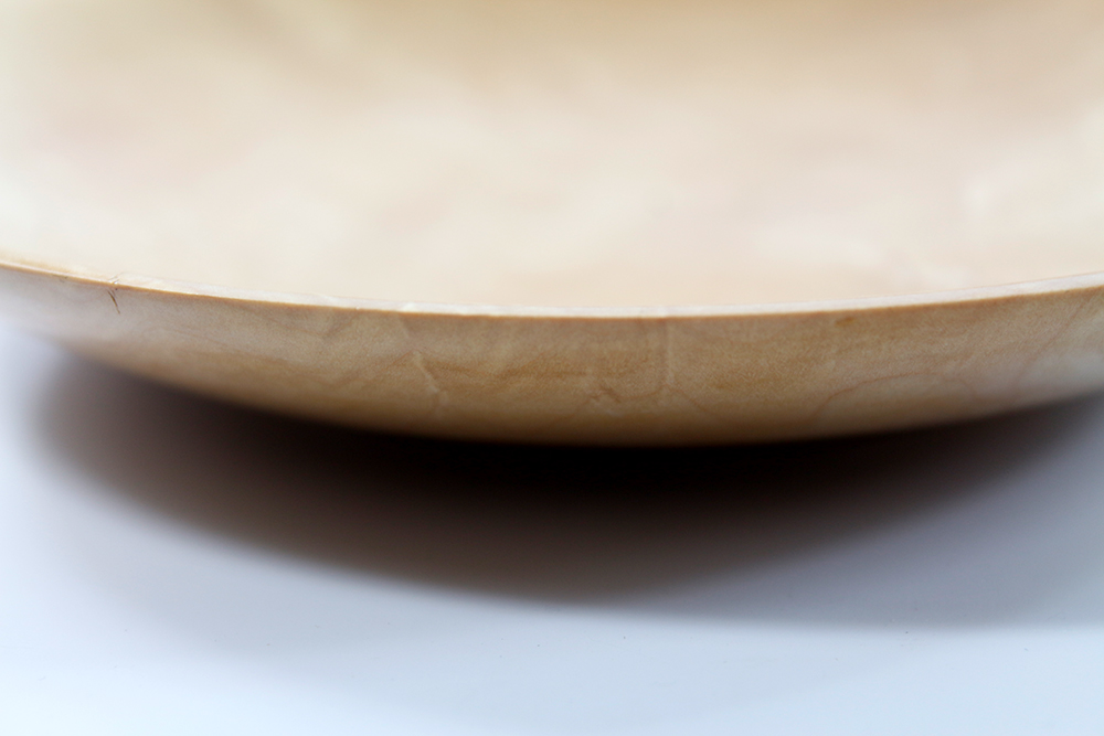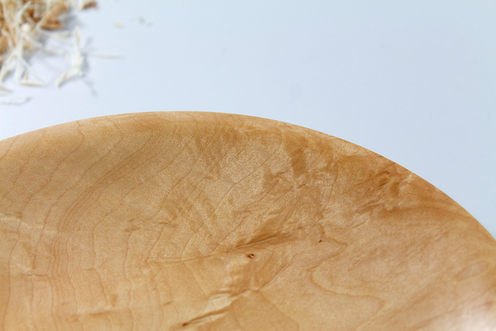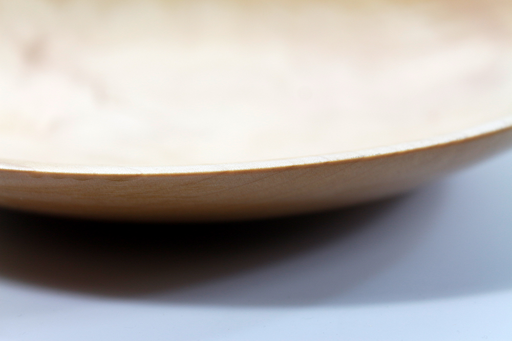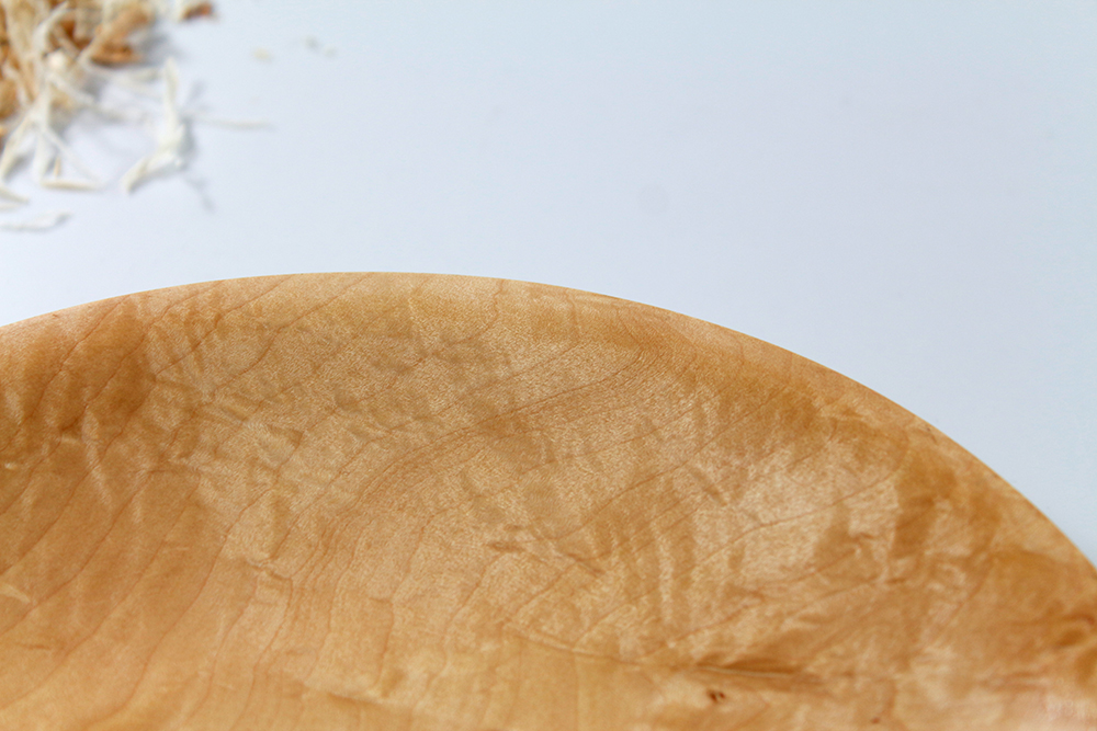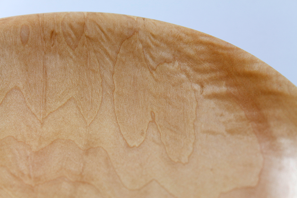 Beim Drehen dieser riesigen Stücke sah ich, wie wunderschön geflammt (Riegelwuchs) das Holz ist. Es hat eine Dreidimensionalität wie ? Perlmutt. Eine wunderschöne Farbe, Splint hell und breit, der Kern dunkel und mit Schlieren durchzogen. Das Wasser spritzte nur so beim Drehen und natürlich verzogen sich die Schalen wunderschön beim Trocknen.