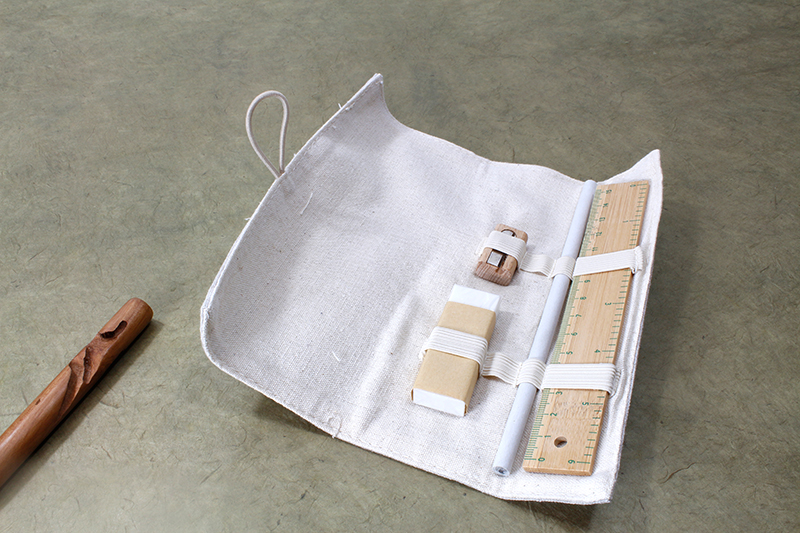 Enthalten ist ein Holzlineal, das in cm und Zoll misst, ein Bleistift, ein Radiergummi, ein Anspitzer und natürlich ein freier Platz für ein Schreibgerät aus meiner Kollektion.