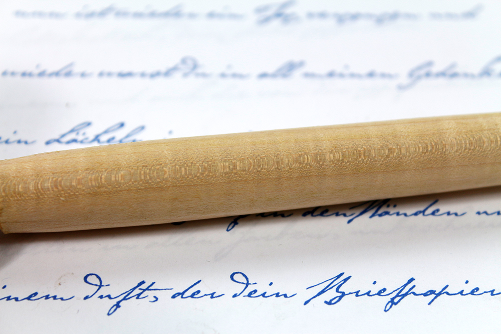 Beim Drehen sah ich, wie wunderschön geflammt (Riegelwuchs) das Holz ist. Es hat eine Dreidimensionalität wie ? Perlmutt. Eine wunderschöne Farbe, Splint hell und breit, der Kern dunkel und mit Schlieren durchzogen. Und es wird immer weniger! Bei den Stiften ist die Riegelung als zartes Wellenmuster zu sehen.