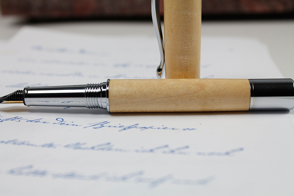Beim Drehen sah ich, wie wunderschön geflammt (Riegelwuchs) das Holz ist. Es hat eine Dreidimensionalität wie ? Perlmutt. Eine wunderschöne Farbe, Splint hell und breit, der Kern dunkel und mit Schlieren durchzogen. Und es wird immer weniger! Bei den Stiften ist die Riegelung als zartes Wellenmuster zu sehen.