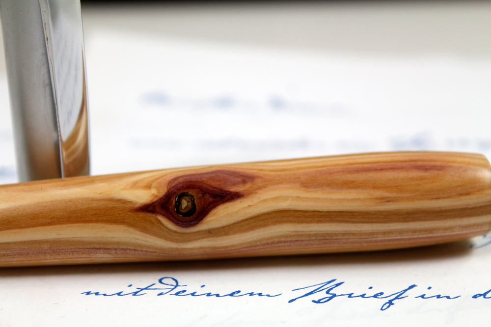 Da das Stammwachstum des Flieders in die Breite sehr langsam ist, hat sein Holz besonders feine Jahresringe. Sie schimmern hellbraun und oft durchzieht ein lila Faden das Holz.