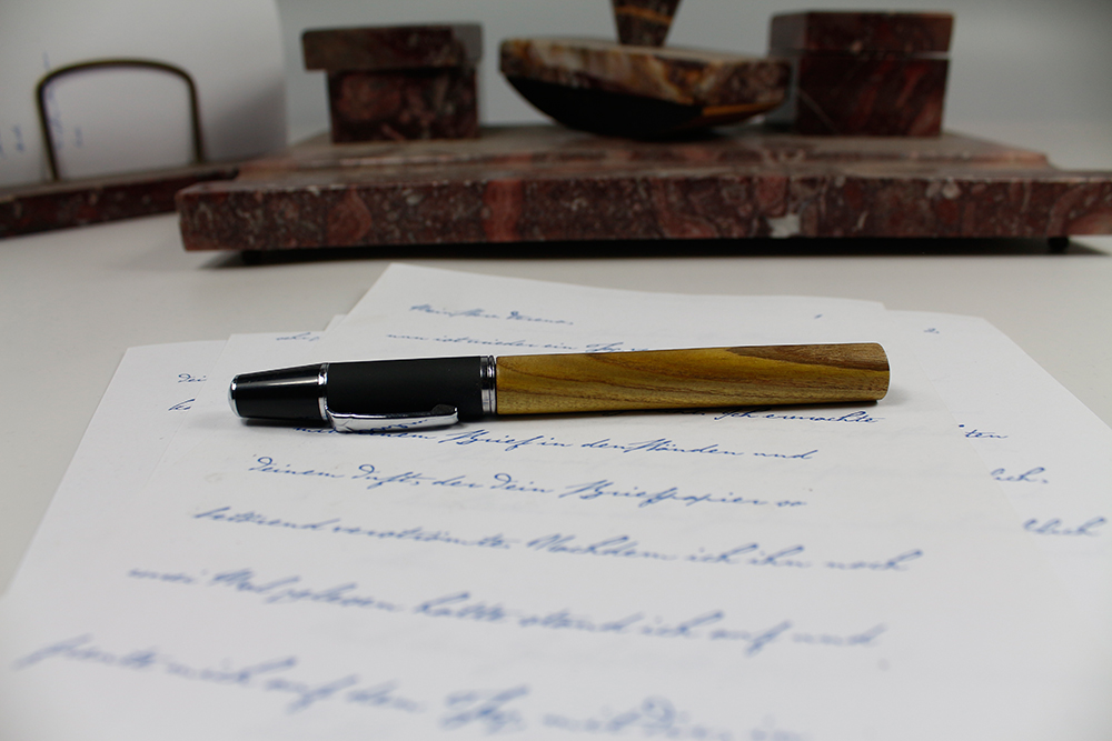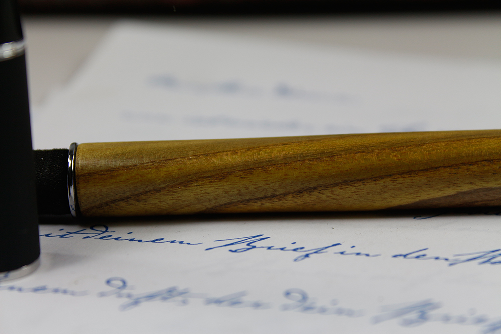 Sollten Sie Ihr Schreibgerät einmal nicht finden, suchen Sie es mit UV Licht. Das Holz des Essigbaumes leuchtet dann wohl neongelb. Aber es ist auch so wunderschön, ein sehr weißes Splintholz ummantelt einen grün schimmernden Kern mit sehr dunklen, fast schwarzen Jahresringen. Das Holz ist leicht, hat ziemlich weite Jahresringe.