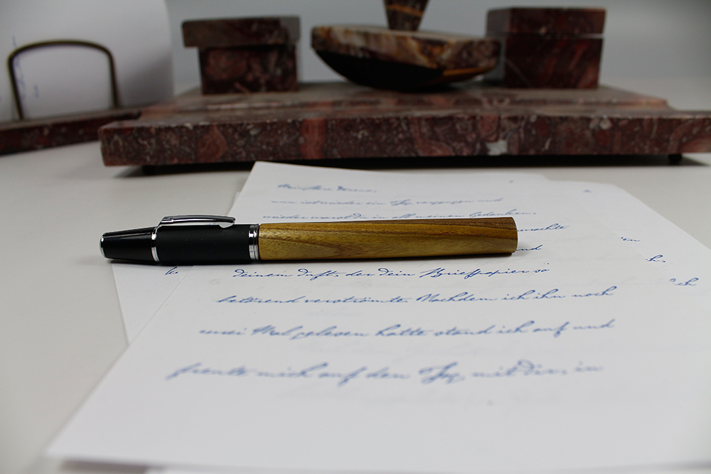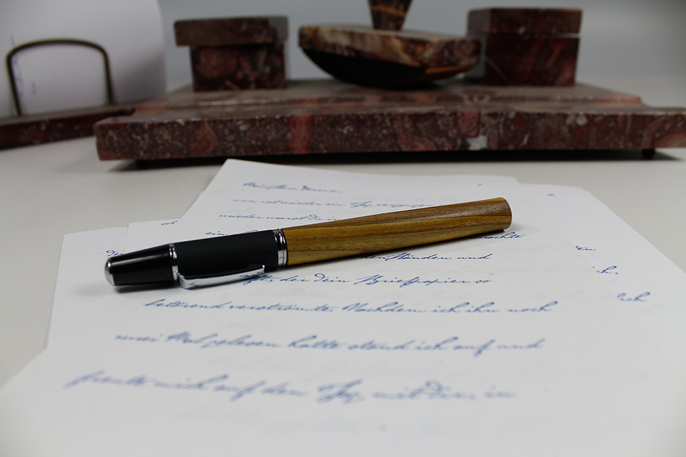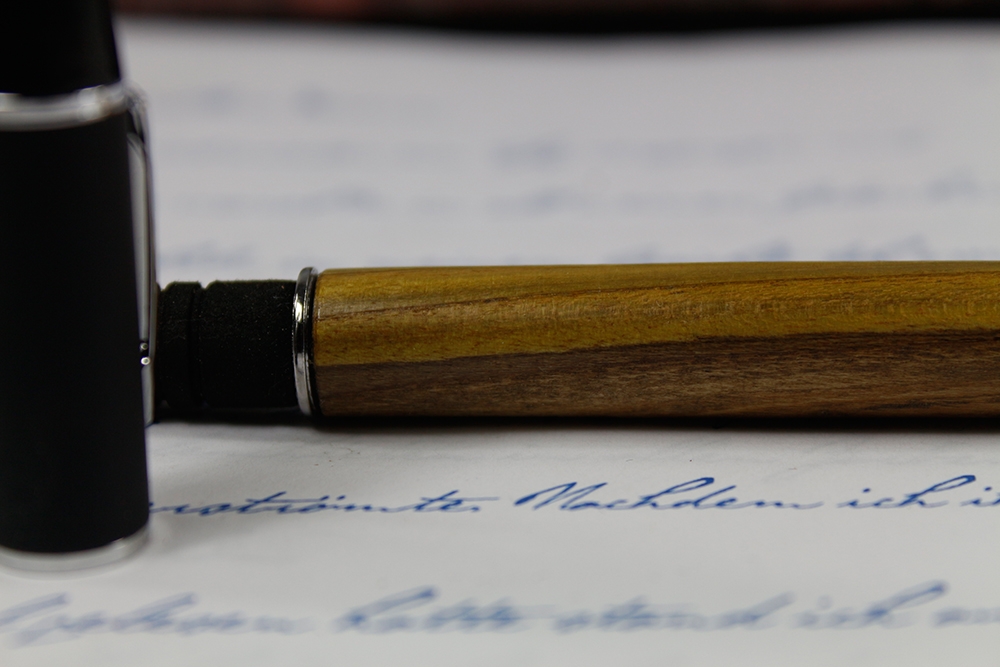 Sollten Sie Ihr Schreibgerät einmal nicht finden, suchen Sie es mit UV Licht. Das Holz des Essigbaumes leuchtet dann wohl neongelb. Aber es ist auch so wunderschön, ein sehr weißes Splintholz ummantelt einen grün schimmernden Kern mit sehr dunklen, fast schwarzen Jahresringen. Das Holz ist leicht, hat ziemlich weite Jahresringe.