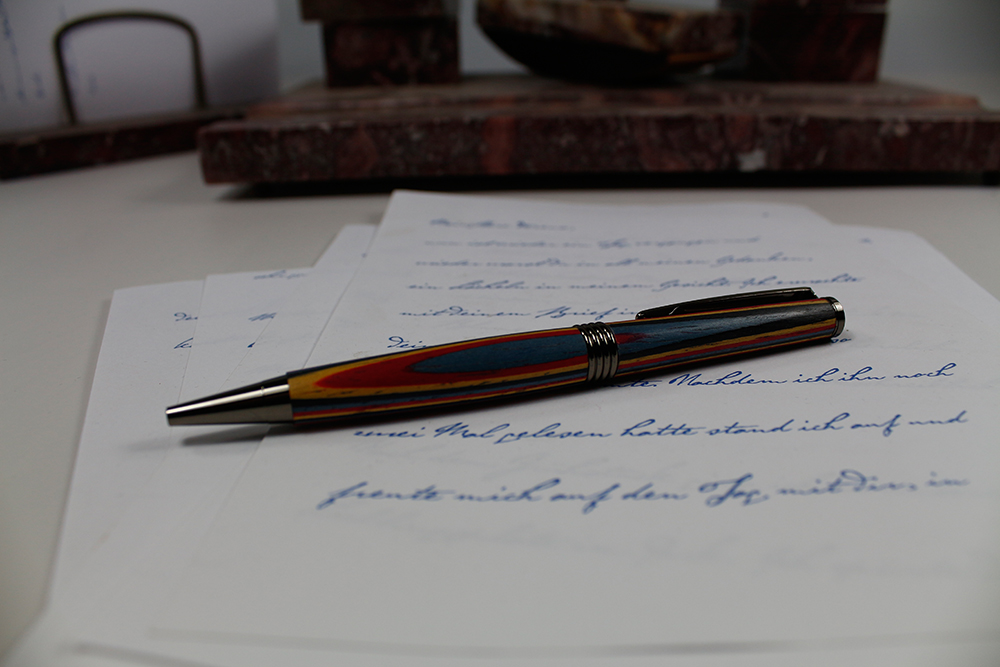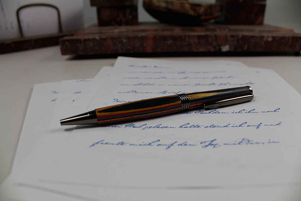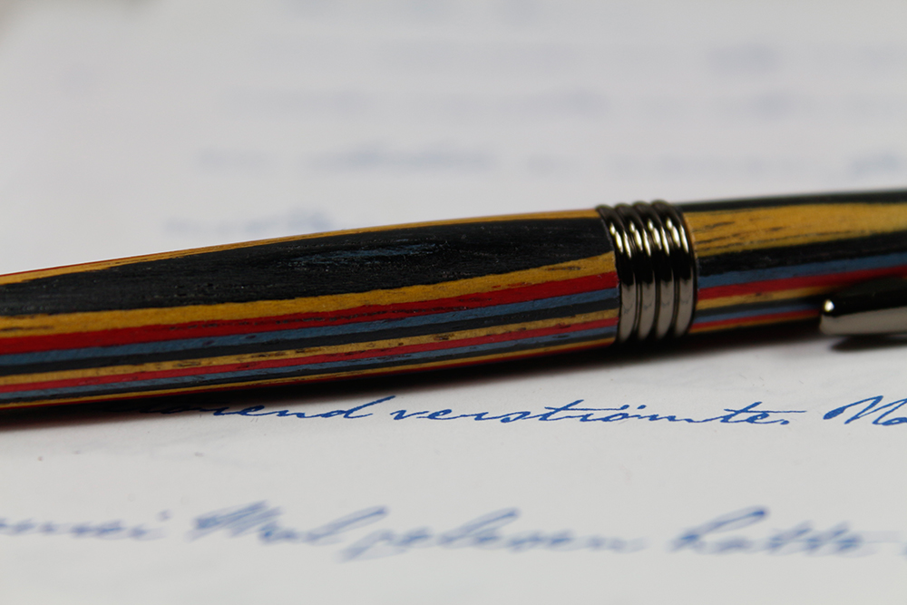 Hier wurden verschiedene Furnierplatten verleimt. Ich finde es entstand eine interessante Struktur. Beim Drehen des Stiftes schimmert das Furnier wie Perlmut.