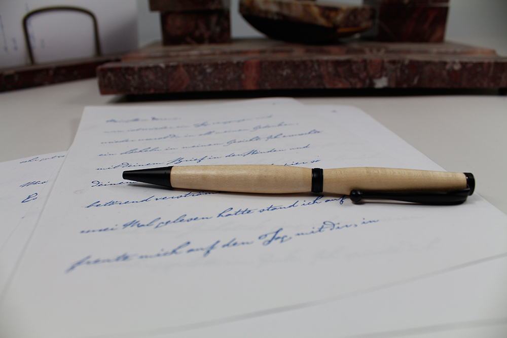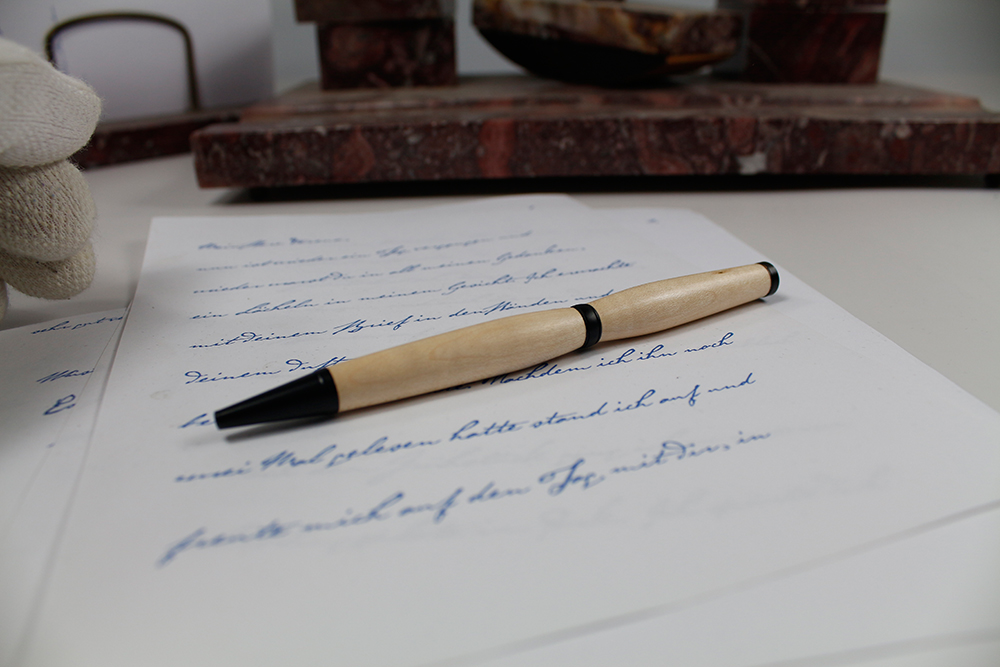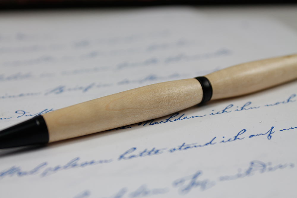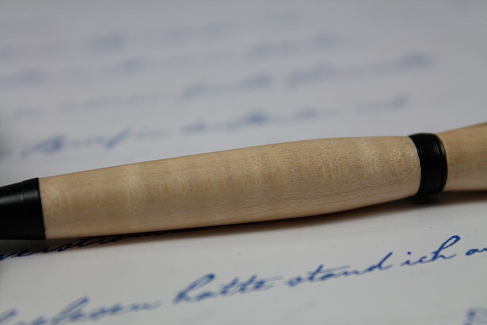 Beim Drehen sah ich, wie wunderschön geflammt (Riegelwuchs) das Holz ist. Es hat eine Dreidimensionalität wie ? Perlmutt. Eine wunderschöne Farbe, Splint hell und breit, der Kern dunkel und mit Schlieren durchzogen. Und es wird immer weniger! Bei den Stiften ist die Riegelung als zartes Wellenmuster zu sehen.