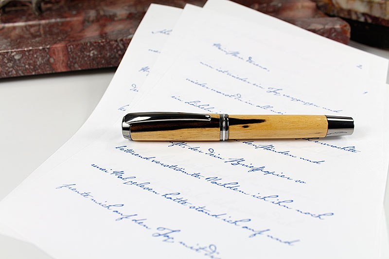 Und so selten wie dieses Holz, ist dieser aus ihm gefertigte Federhalter einmalig. Die schwarzen Adern durchziehen das Holz unvorhersehbar und eben -einmalig. Es wird auch "Royal White Ebony" (Königlich weißes Ebenholz) genannt.