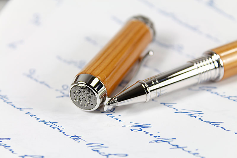 Mittelschwerer, sehr hochwertiger und edler Rollerball. Banderole, Kappenspitze und Stiftende sind aus Titan, die Gravuren in Handarbeit eingearbeitet. Alle sichtbaren Metallteile sind mit extrem hartem Rhodium beschichtet.