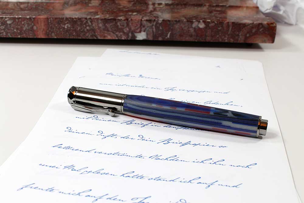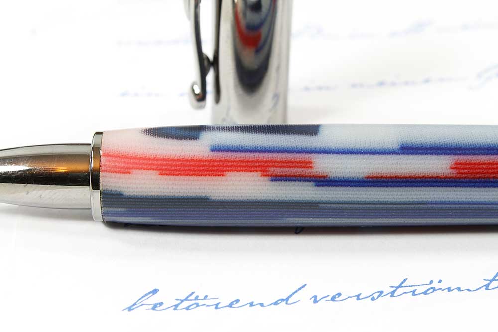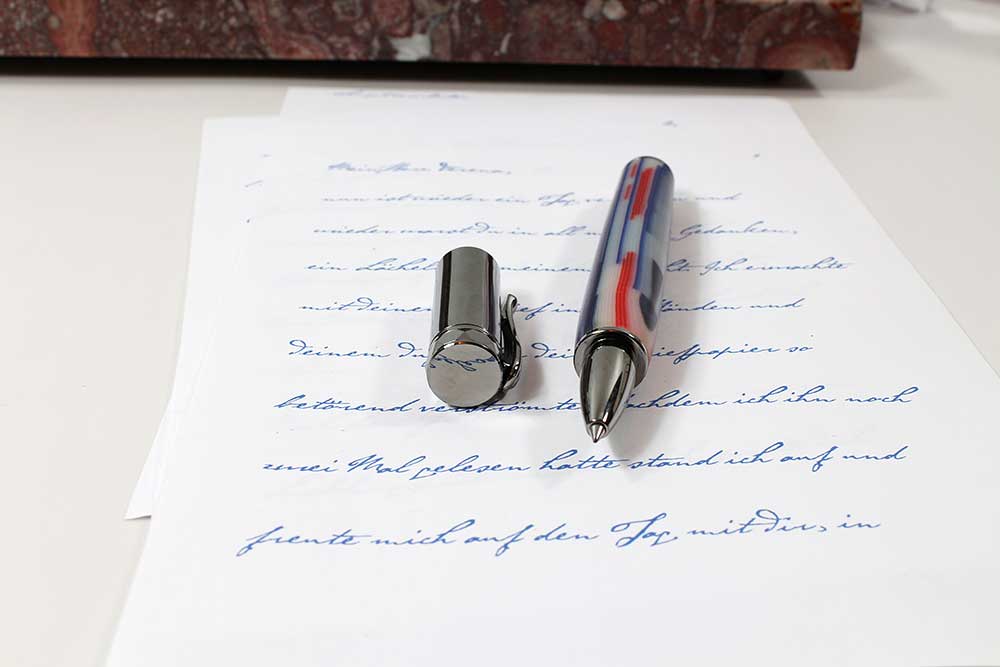 Statt eines Gewindes sitzt in der Kappe ein Magnet. Also kein Schrauben mehr, nur noch ein Klick. Wärend des Schreibens können Sie die Kappe auch auf das Endstück setzen.