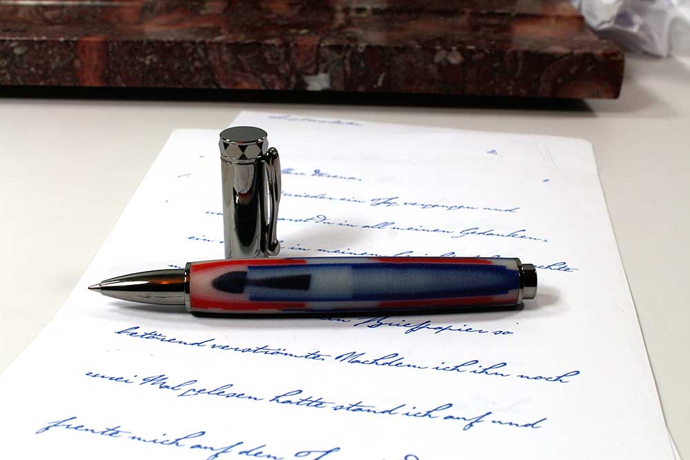 Laminat aus dem Hertha BSC Trikot meines Neffen entstanden. Viele kleine Stoffetzen sind in diesem Rollerball verarbeitet. Von welchem Sponsor das N geblieben ist, ob von der Deutschen bahn, Warsteiner, der Berliner Volksbank... wer weiss.