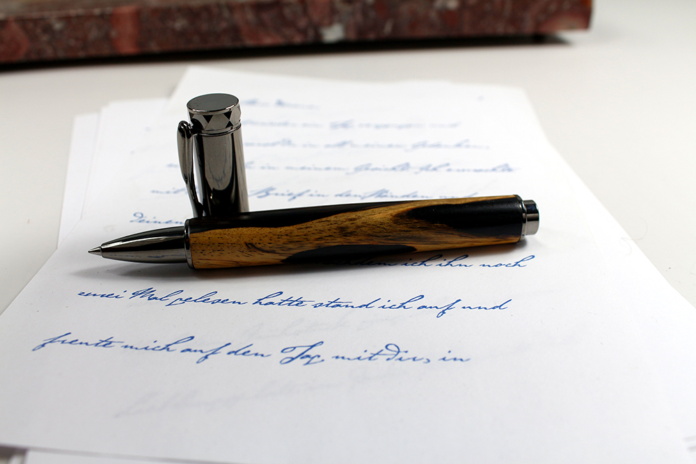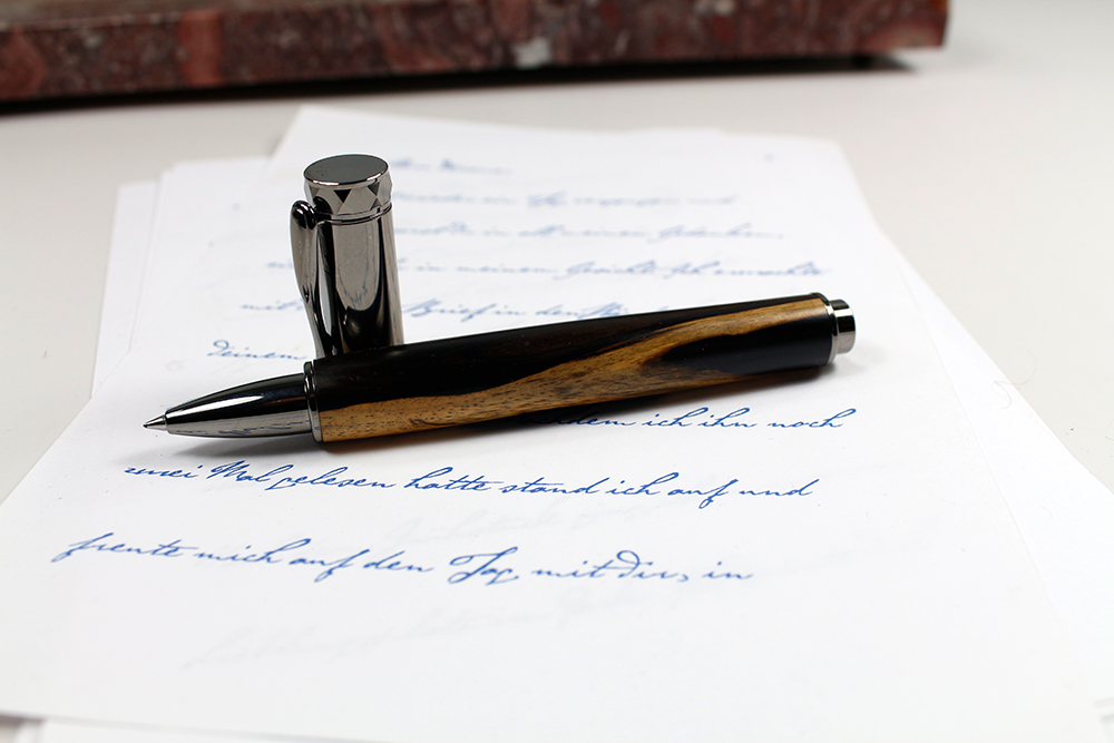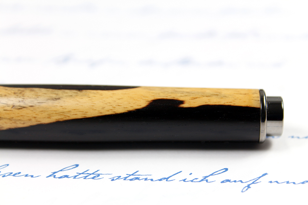 Und so selten wie dieses Holz, ist dieser aus ihm gefertigte Federhalter einmalig. Die schwarzen Adern durchziehen das Holz unvorhersehbar und eben -einmalig. Es wird auch "Royal White Ebony" (Königlich weißes Ebenholz) genannt.