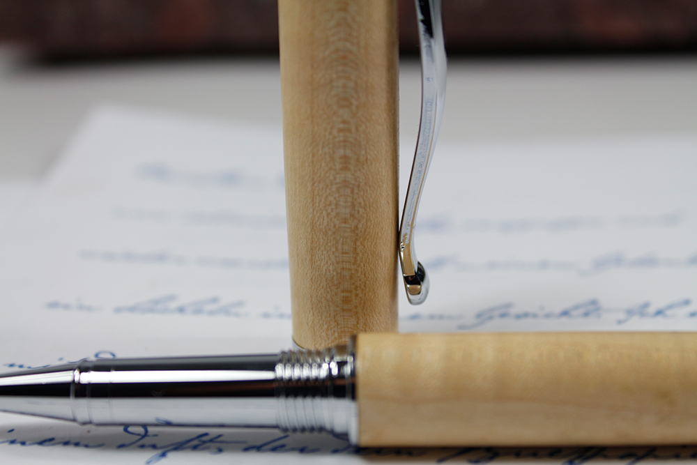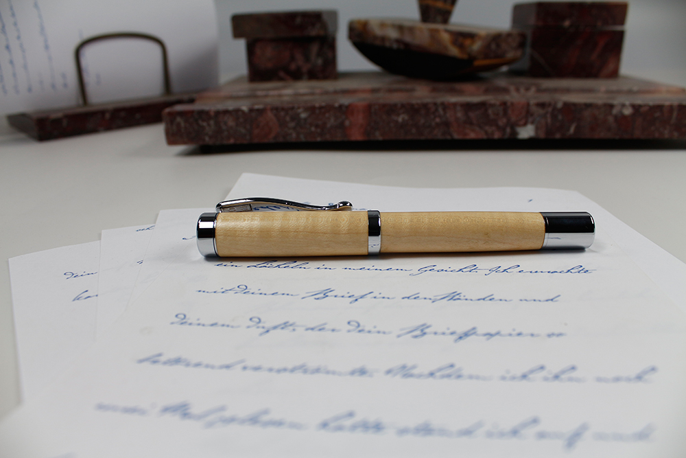 Beim Drehen sah ich, wie wunderschön geflammt (Riegelwuchs) das Holz ist. Es hat eine Dreidimensionalität wie ? Perlmutt. Eine wunderschöne Farbe, Splint hell und breit, der Kern dunkel und mit Schlieren durchzogen. Und es wird immer weniger! Bei den Stiften ist die Riegelung als zartes Wellenmuster zu sehen.