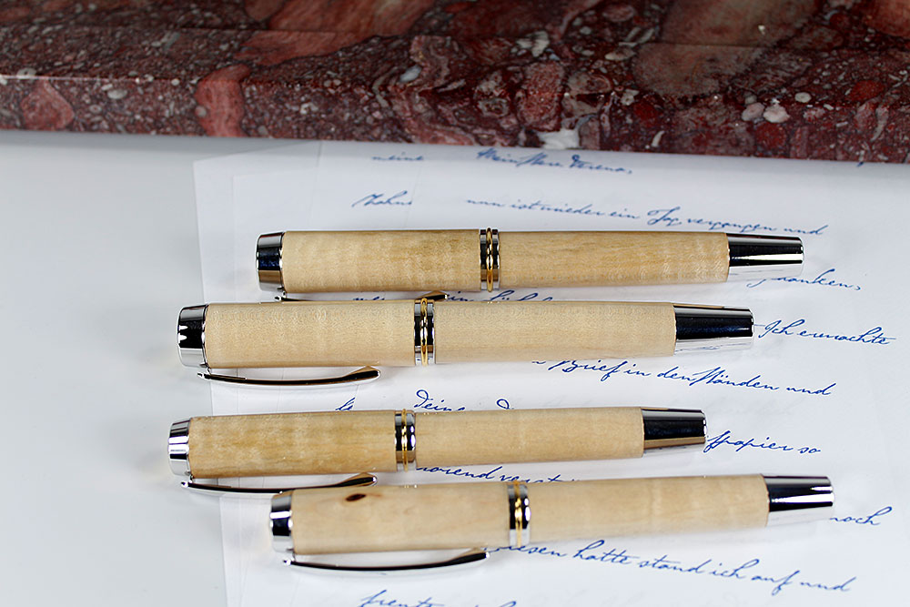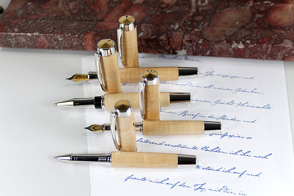 Mittelschwere und schwere, sehr hochwertige und edle Rollerballs und Federhalter. Banderole und Kappenenden sind mit 22k Gold überzogen. Alle sichtbaren Metallteile sind mit extrem hartem Rhodium beschichtet.