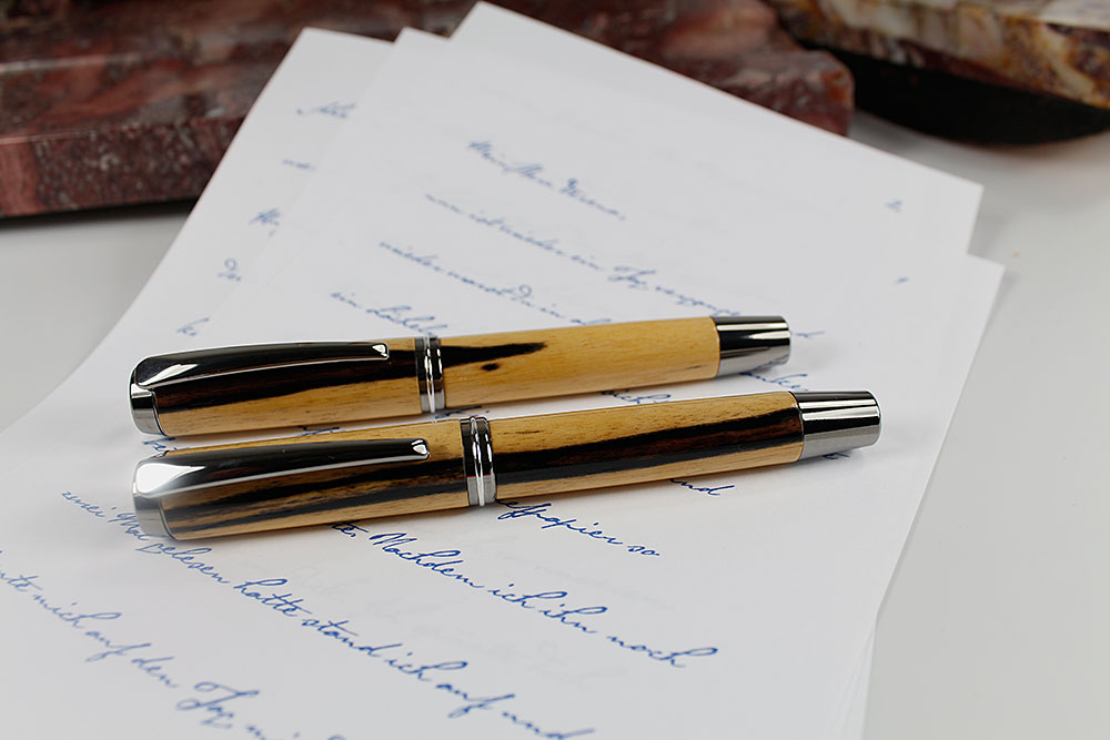 Und so selten wie dieses Holz, ist dieser aus ihm gefertigte Federhalter einmalig. Die schwarzen Adern durchziehen das Holz unvorhersehbar und eben -einmalig. Es wird auch "Royal White Ebony" (Königlich weißes Ebenholz) genannt.