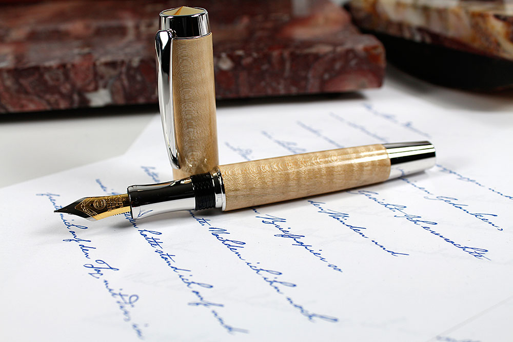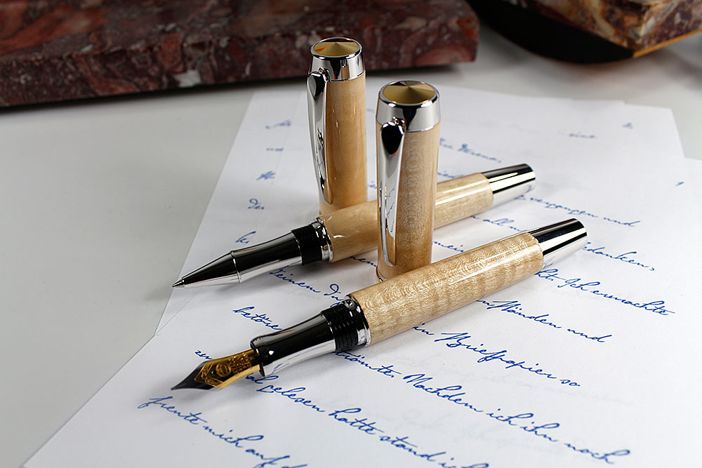 Die Federhalter sind mit einer in Deutschland gefertigten Feder (mit 22k Gold und Rhodium beschichtet) ausgestattet. Die Iridium-Spitze gewährleistet einen gleichmäßigen Tintenfluss und ein sanftes Gleiten der Feder über das Papier.