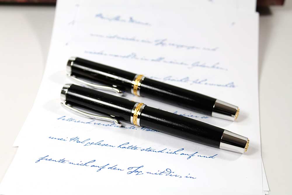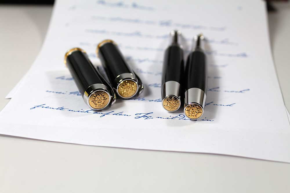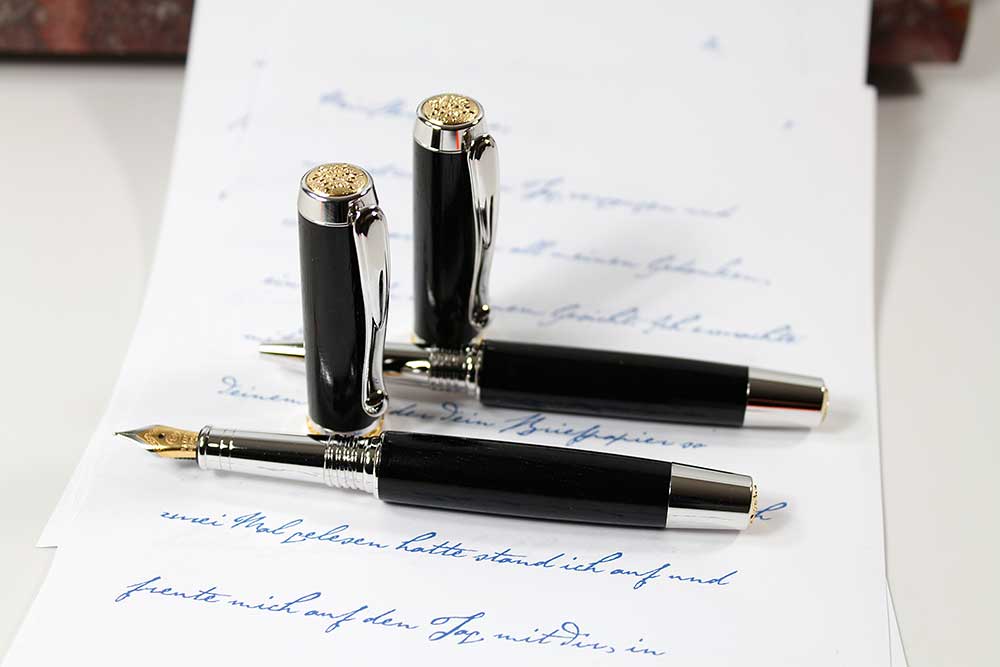 Mittelschwerer, sehr hochwertiger und edler Füllfederhalter und Rollerball. Banderole, Kappenspitze und Stiftende sind aus Gold, die Gravuren in Handarbeit eingearbeitet. Alle sichtbaren Metallteile sind mit extrem hartem Rhodium beschichtet.